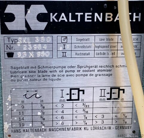 Состояние: хорошее состояние (б/у), Год выпуска: 1991, Функциональность: полностью работоспособен, диаметр пильного диска: 400 мм, Диапазон резки круглой стали при 90°: 145 мм, общая длина: 850 мм, общая высота: 1 800 мм, общая ширина: 1 100 мм, общий вес: 700 кг, Полуавтоматическая холодная дисковая пила, новый пильный диск Ø 400 мм, режущая способность Ø прибл. 145 мм, двигатель 3,0 / 4,0 кВт, 2 скорости 1420/2880 об/мин, вертикальный зажим, 2 ручных горизонтальных зажима, упоры 30°, 45°, 60°, 90° с обеих сторон, система охлаждения, размеры 85 x 110 x 180 см, вес ок. 700 кг